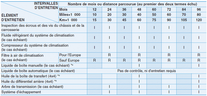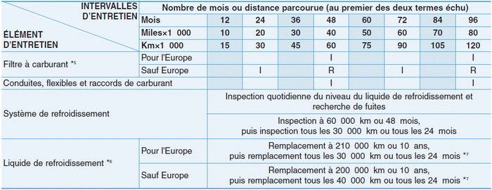 *5 : Le filtre à carburant ne nécessite généralement pas d'entretien. Toutefois, une inspection périodique est recommandée en fonction de la qualité du carburant. En cas de problèmes importants (limitation du débit de carburant, emballement, perte de puissance, démarrage difficile, etc.), remplacez immédiatement le filtre à carburant sans tenir compte du calendrier d'entretien et consultez un concessionnaire HYUNDAI agréé pour en savoir plus.