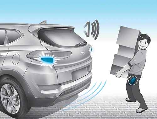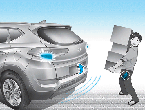 Si vous vous trouvez dans la zone de détection (50-100 cm (20~40 pouces) derrière le véhicule) avec la clé intelligente, les feux de détresse clignotent et une alarme se déclenche pendant environ 3 secondes pour vous informer que la clé a été détectée et que le hayon va s'ouvrir.