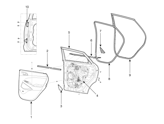 du puits de porte arrière 7. Couvercle extérieur delta de porte arrière 8. Caoutchouc d’étanchéité latéral de la porte arrière 9. Caoutchouc d’étanchéité latéral de porte arrière 10. Charnière de la porte arrière |