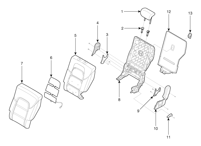 | 1. Appui-tête du siège arrière 2. Guide d'appuie-tête de siège arrière 3. Recouvrement intérieur de protection interne du coussin de siège arrière 4. Recouvrement de protection interne du coussin de siège arrière 5. Rembourrage du dossier de siège arrière 6. Chauffage du dossier de siège arrière 7. Revêtement de dossier de siège arrière |