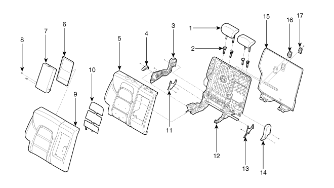 arrière 11. Recouvrement intérieur du coussin externe de siège arrière 12. Ensemble de l'armature du dossier de siège arrière 13. Recouvrement intérieur de protection interne du coussin de siège arrière 14. Recouvrement de protection interne du coussin de siège arrière 15. Tapis arrière de siège arrière 16. Couvercle de l'ancrage pour enfants 17. Suspension du siège arrière |