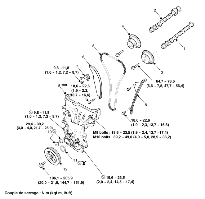 de la chaîne de distribution 9. Couvercle de la chaîne de distribution 10. Boulon et joint du bouchon de service 11. Joint d'huile avant 12. Poulie d'amortisseur du vilebrequin |
