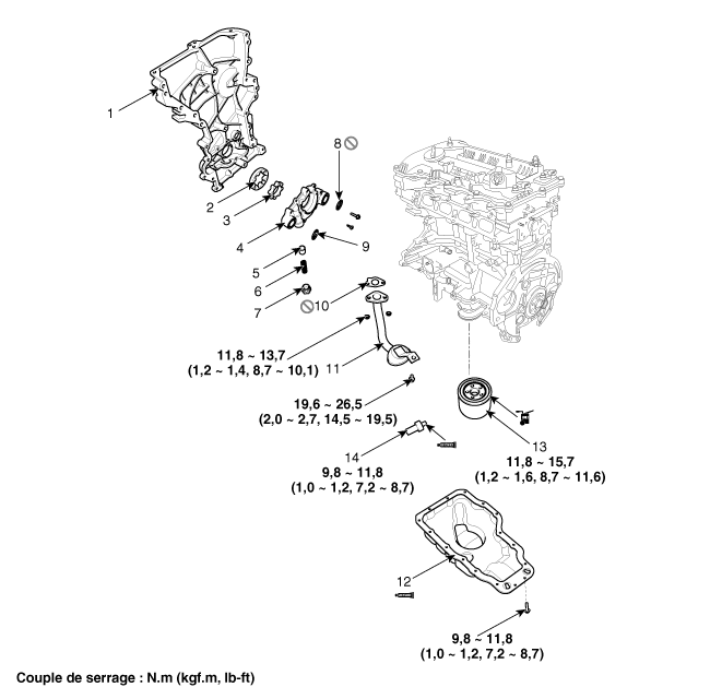 torique (côté aspiration) 9. Joint torique (côté décharge) 10. Joint de crépine d'huile 11. Crépine d'huile 12. Carter d’huile 13. Filtre à huile 14. OPS (interrupteur de pression d'huile) |