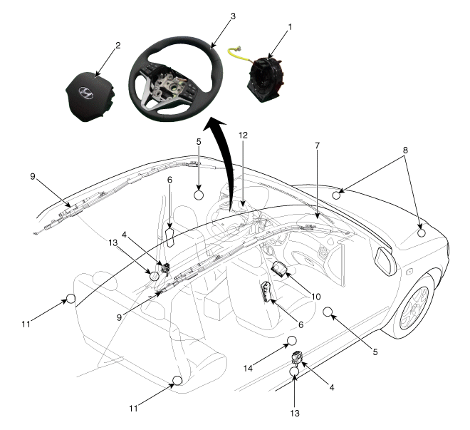 | 1. Ressort spiral 2. AIRBAG DU CONDUCTEUR (DAB) 3. Volant de direction 4. Prétendeur de ceinture de sécurité (BPT) 5. Capteur d'impact latéral de pression (P-SIS) 6. Airbag latéral (SAB) 7. Airbag du passager (PAB) |