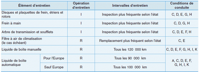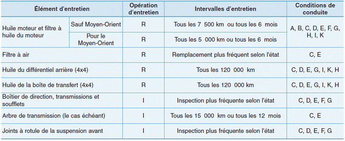 Les éléments suivants doivent être entretenus plus fréquemment sur les véhicules principalement utilisés dans des conditions extrêmes. Voir le tableau ci-dessous pour connaître les intervalles d'entretien appropriés.