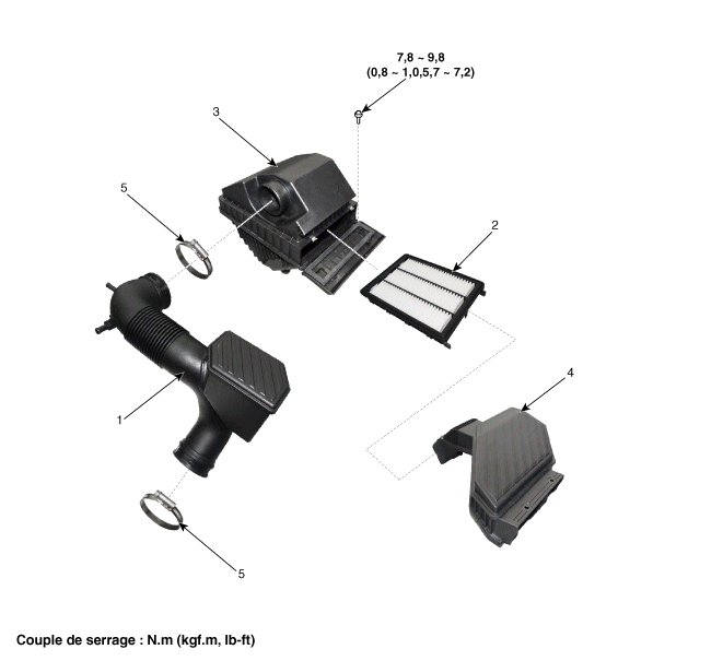 | 1. Flexible d'admission d'air 2. Élément du filtre à air 3. Corps du filtre à air  |