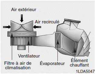 Le filtre à air de climatisation installé derrière la boîte à gants filtre les poussières et autres polluants qui pénètrent dans le véhicule par le biais du système de chauffage et de climatisation. Si de la poussière ou d'autres polluants s'accumulent dans le filtre, le flux d'air provenant des aérateurs peut diminuer, entraînant une augmentation de l'humidité au niveau du pare-brise, même lorsque la position Air extérieur (frais) est sélectionnée.