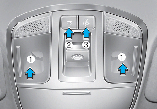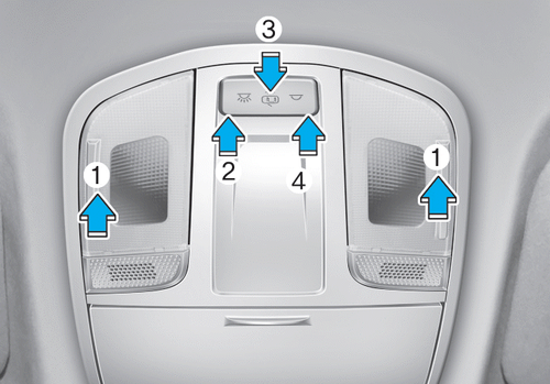 Le plafonnier avant/arrière s'allume automatiquement pendant environ 15 secondes lorsque l'émetteur (la clé intelligente) déverrouille les portes. L'éclairage s'éteint progressivement si vous mettez le contact en position ON dans les 15 secondes. Le plafonnier reste allumé pendant environ 20 minutes lorsque le contact est en position ACC ou OFF et que l'une des portes est ouverte.