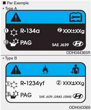 Vous pouvez découvrir quel fluide réfrigérant du système de climatisation est appliqué à votre véhicule sur l'étiquette située à l'intérieur de la hotte. Reportez-vous au chapitre 8 pour l'emplacement de l'étiquette du liquide réfrigérant de la climatisation.