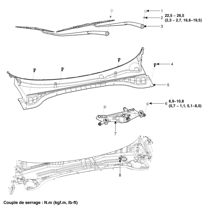 5. Couvercle supérieur de auvent 6. Boulon 7. Ensemble du moteur et tringlerie de l’essuie-glace 8. Connecteur du moteur de l’essuie-glace |