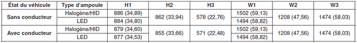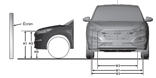 H1 : Hauteur entre le point central de l'ampoule du phare et le sol (feu de croisement)