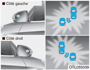 Si un véhicule est détecté dans la zone couverte par le système, un témoin s'allume sur le rétroviseur extérieur.