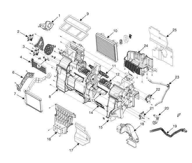 19. Flexible 20. Tube de refroidissement 21. Actionneur de commande de température [D] 22. Actionneur de désembuage automatique 23. Tuyau de vidange 24. Carter inférieur du chauffage 25. Patin de l'unité de chauffage |